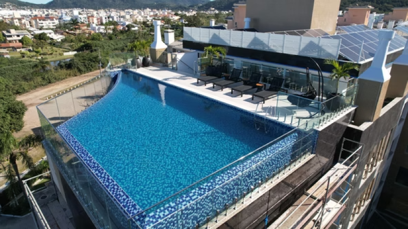 No ático, a área de lazer reúne salão de festas, praça de fogo, academia e piscina de borda infinita com vista panorâmica para o mar, unindo o azul das águas ao verde da natureza em um cenário único.