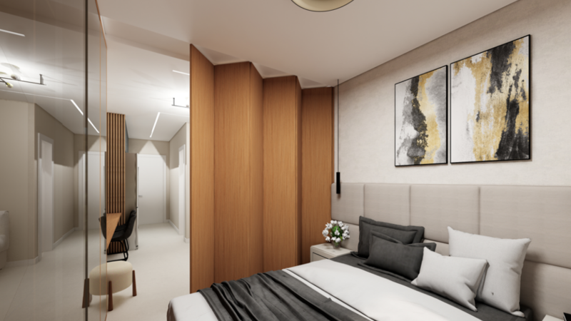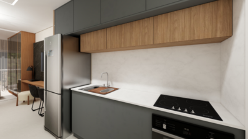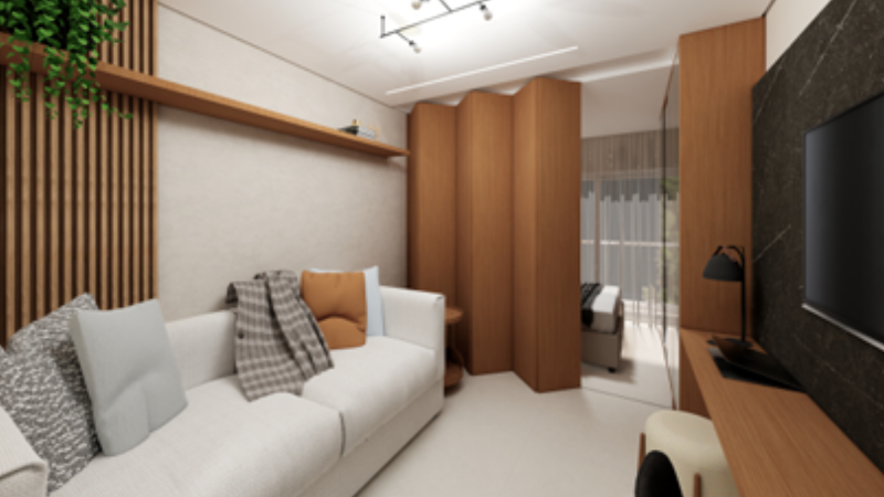 Studio, Unidade 202, com 23,63 m² de área privativa, sem vaga de garagem, tipologia ideal para locação por temporada, com menor custo de aquisição e alta liquidez.